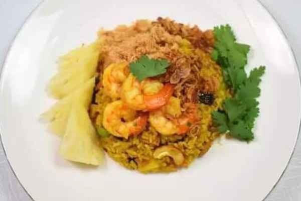 Thai fried rice with pineapple, eggs, onions, scallions, and cashew nuts.