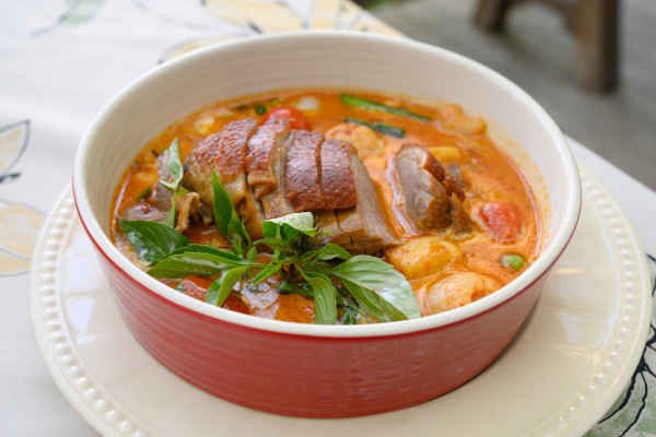 Crispy duck topped with eggplant and tamarind sauce. Served with jasmine rice.