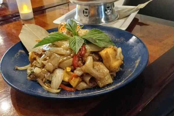 Broad rice noodle, egg, garlic, chili, basil, bell pepper and onion.
