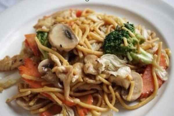 Stir-fried lo mien noodle with mushroom, carrot, napa and broccoli in garlic sauce.