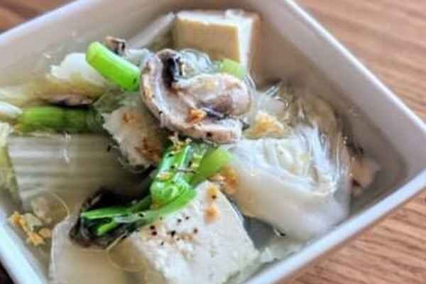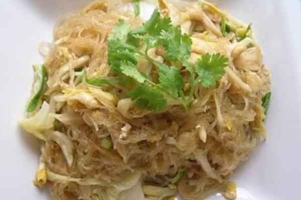 Sauteed glass noodles with napa, onion, scallion, tomato, mushroom and carrot.